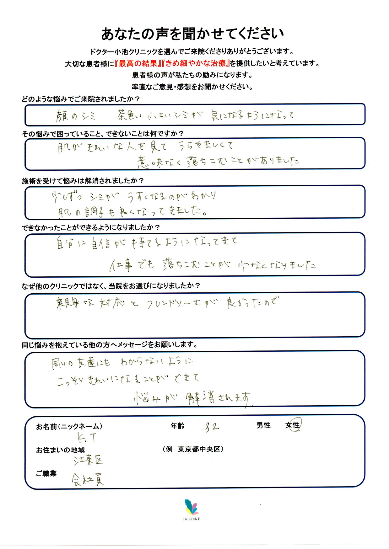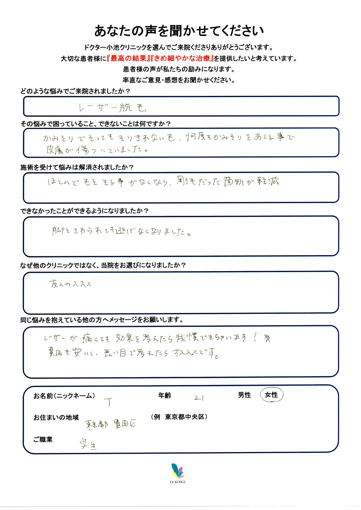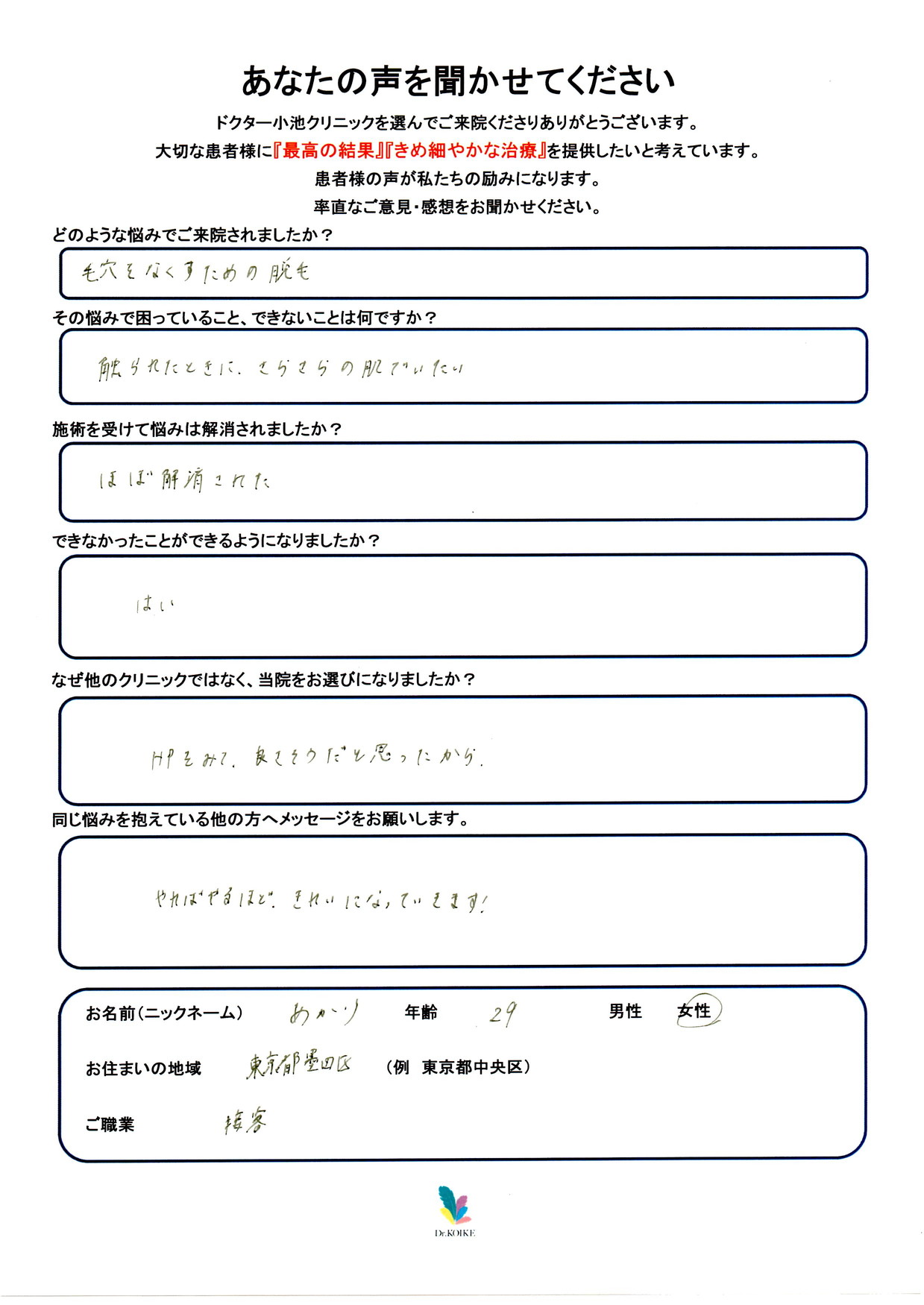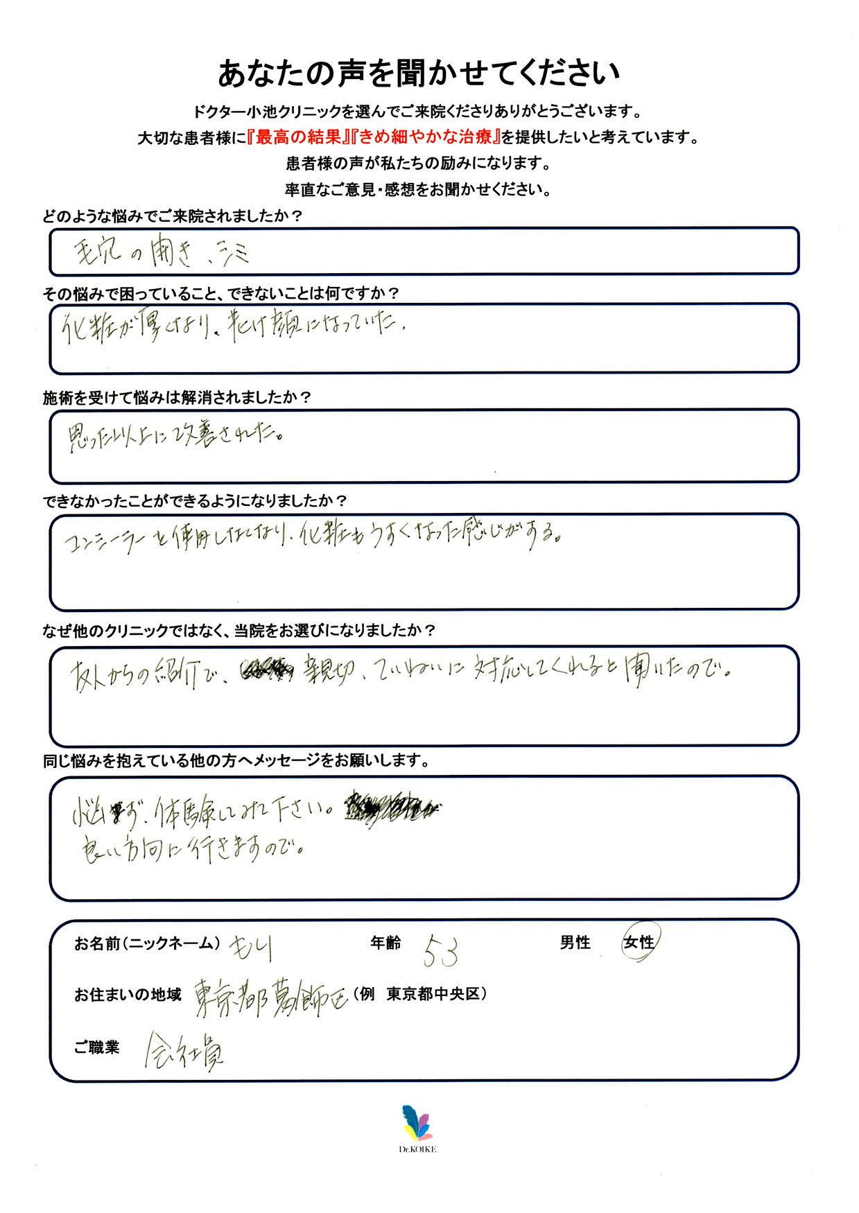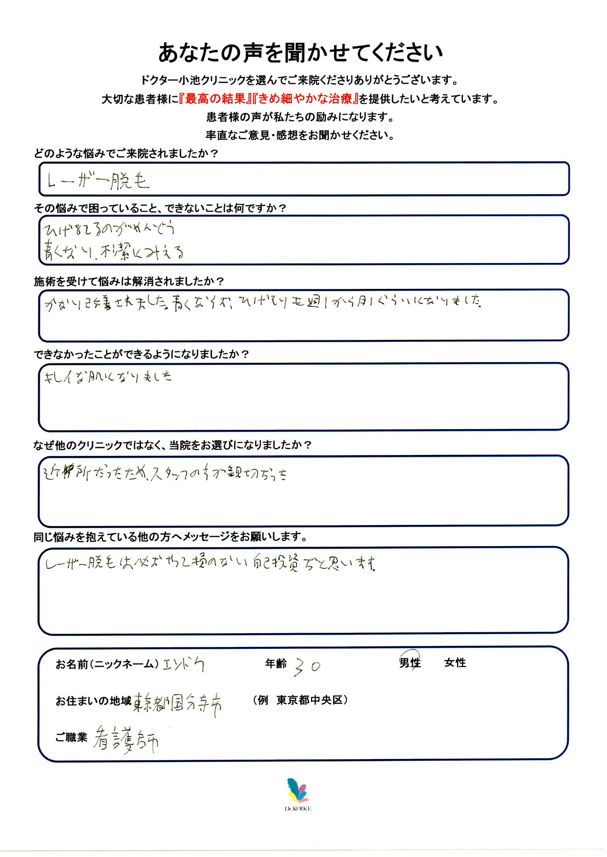 レーザーでイボも二カ所取って頂きましたが、ほとんど目立たなくなりました。もっと早く来れば良かったと思っています。