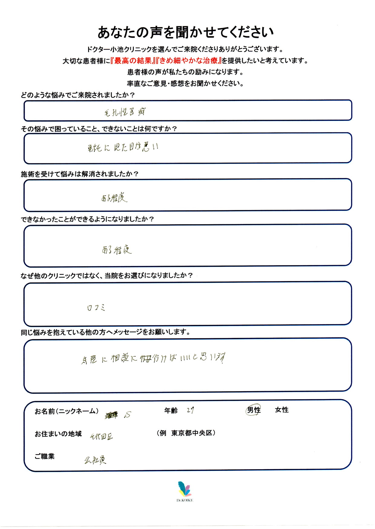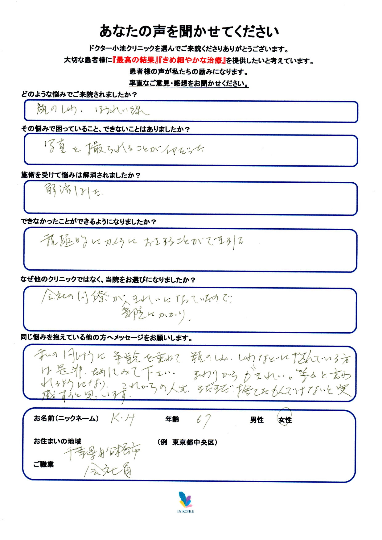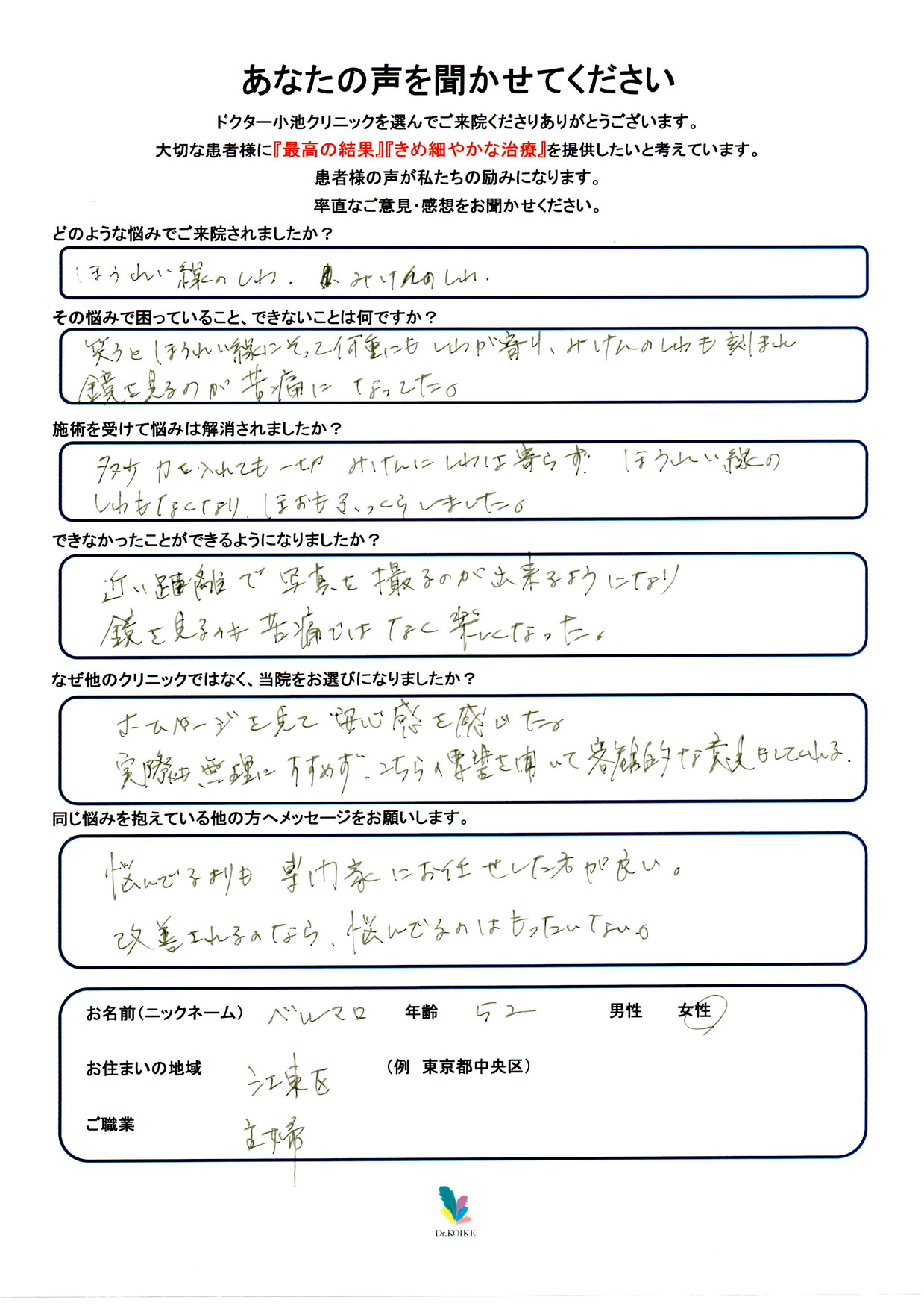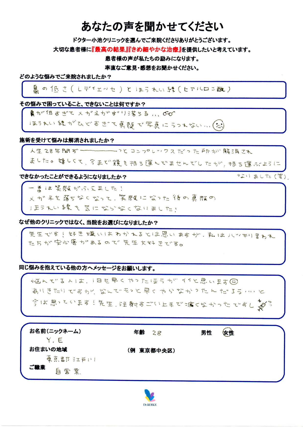 レーザーでイボも二カ所取って頂きましたが、ほとんど目立たなくなりました。もっと早く来れば良かったと思っています。