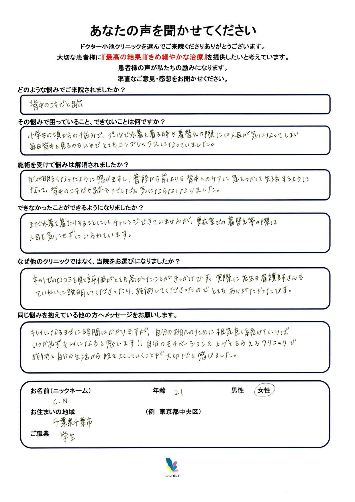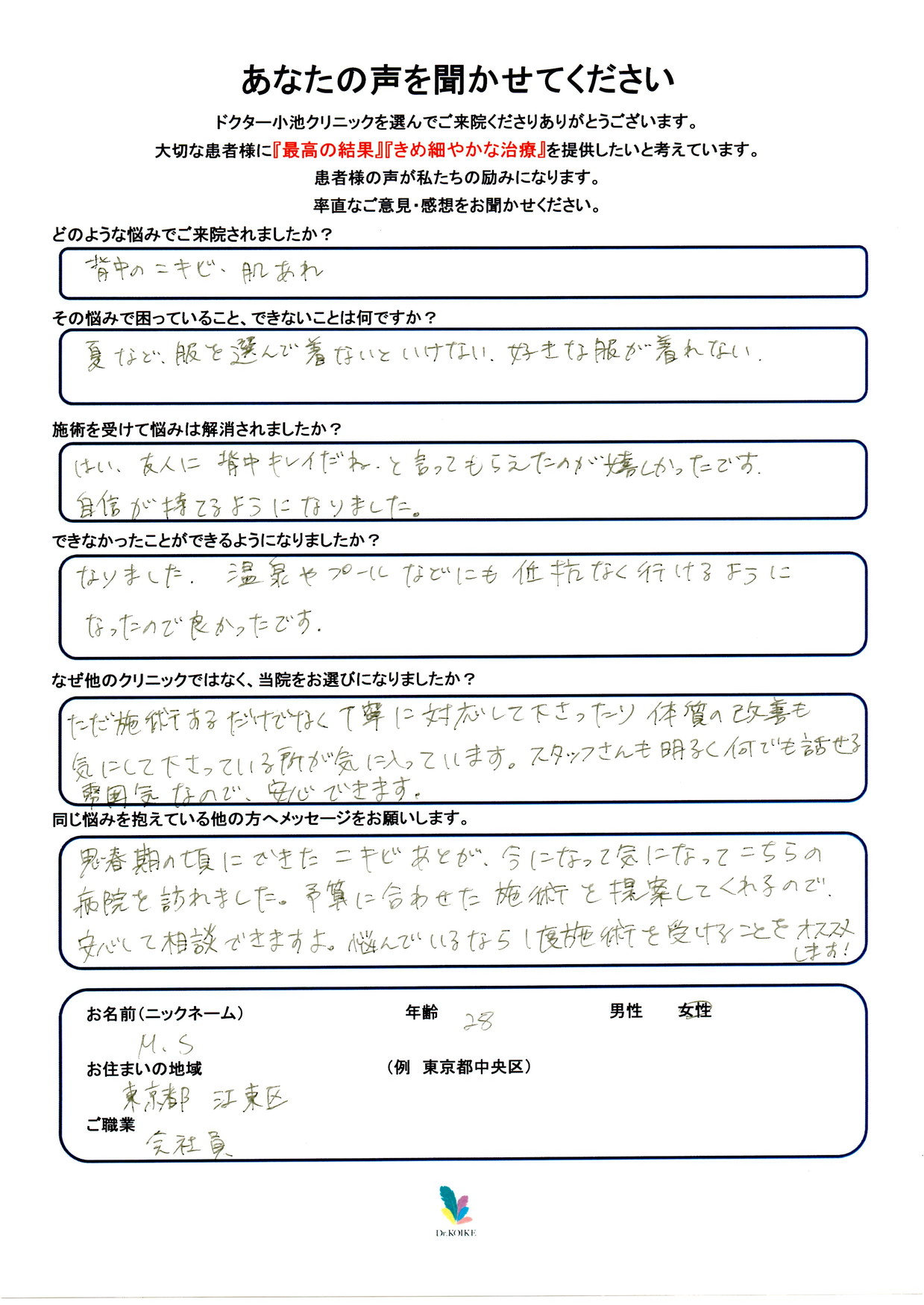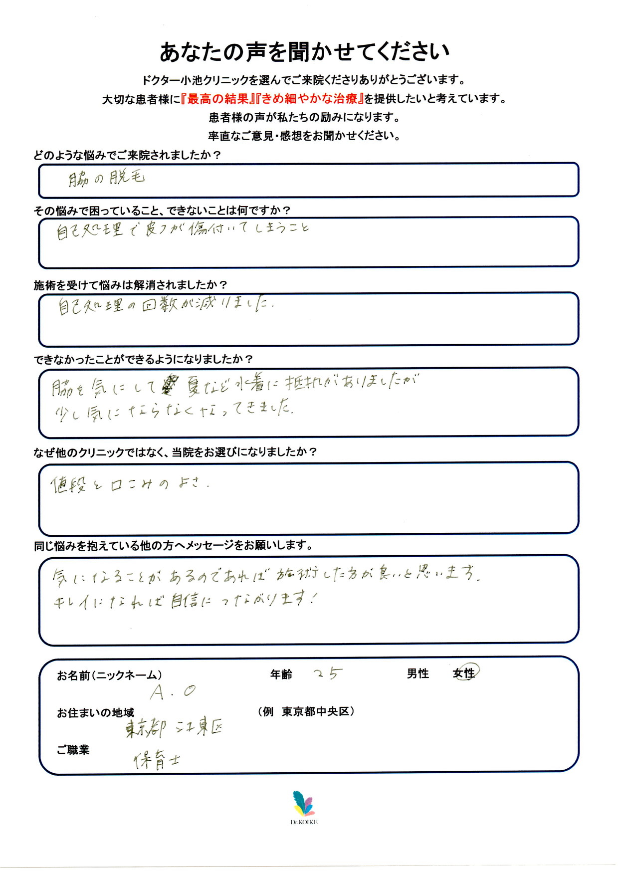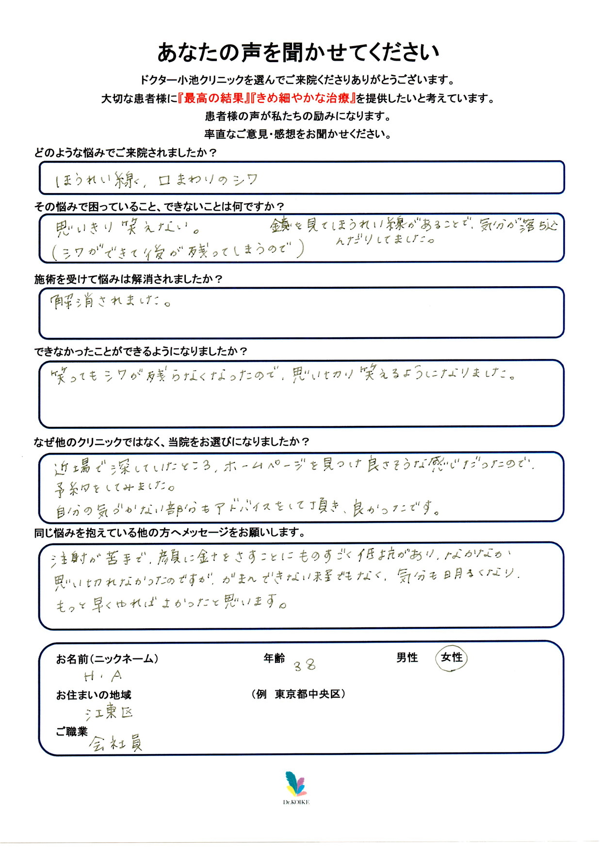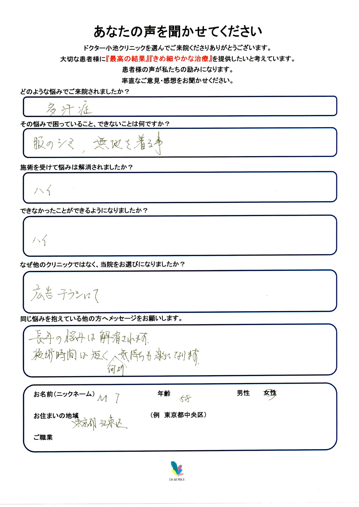 レーザーでイボも二カ所取って頂きましたが、ほとんど目立たなくなりました。もっと早く来れば良かったと思っています。