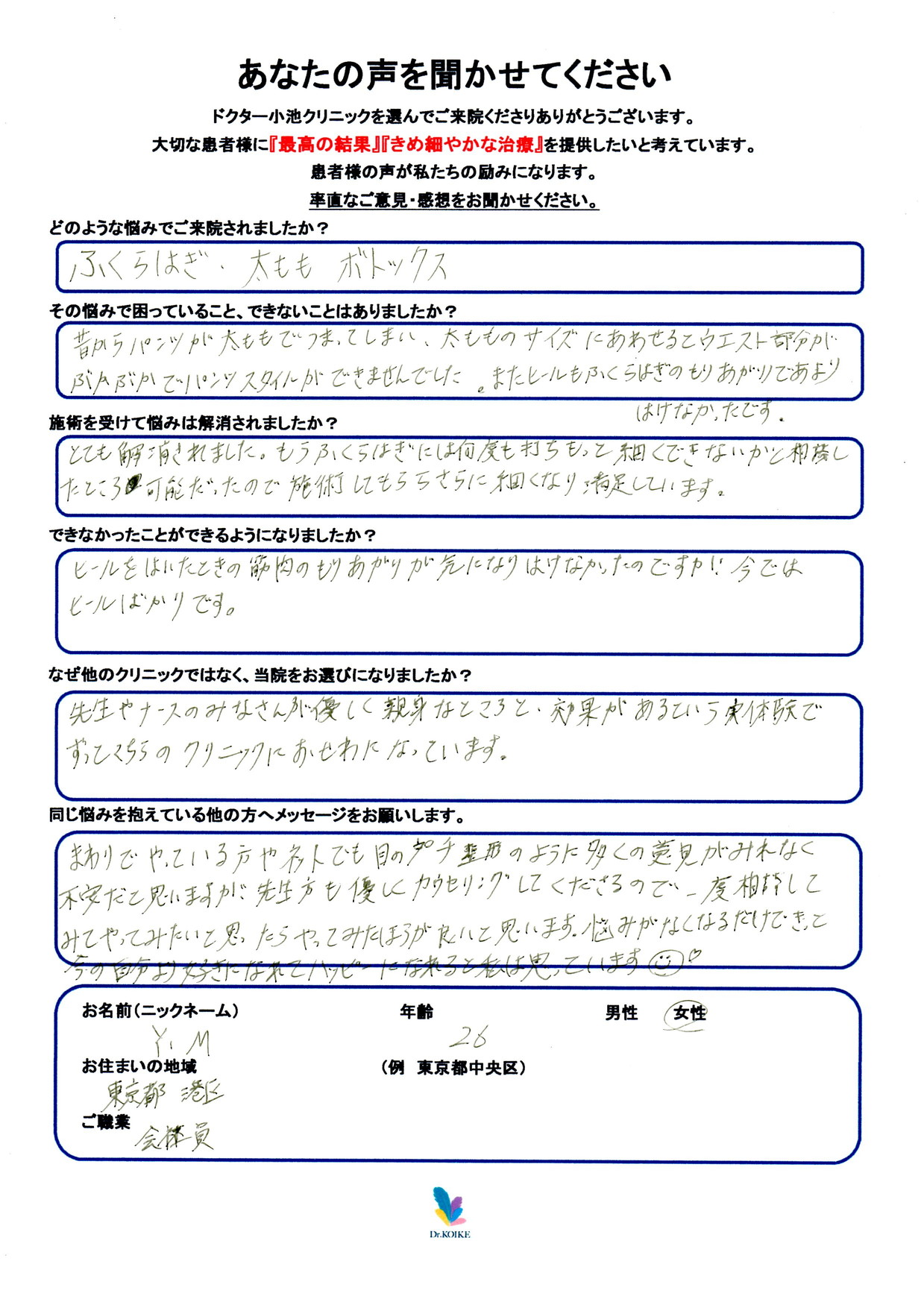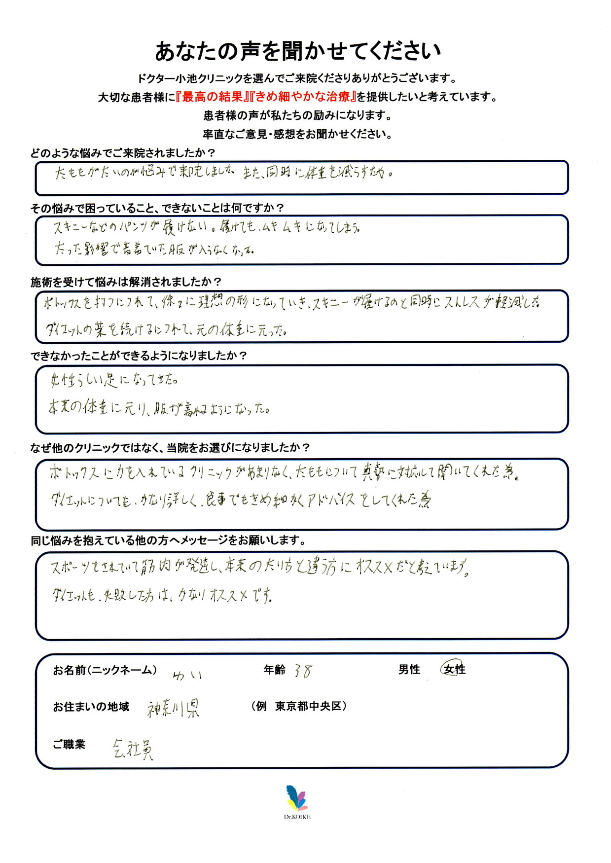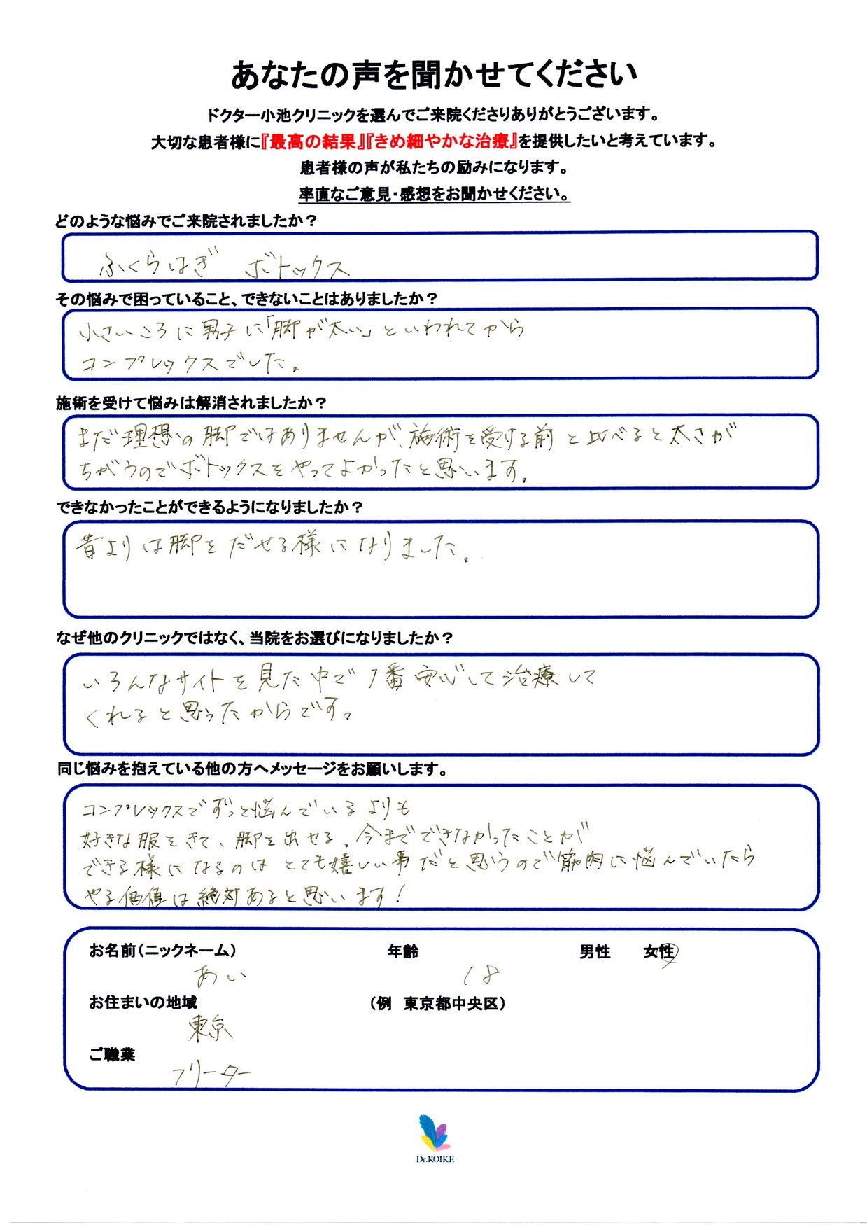 まだ理想の脚ではありませんが、施術を受ける前と比べると太さがちがうのでボトックスをやってよかったと思います。