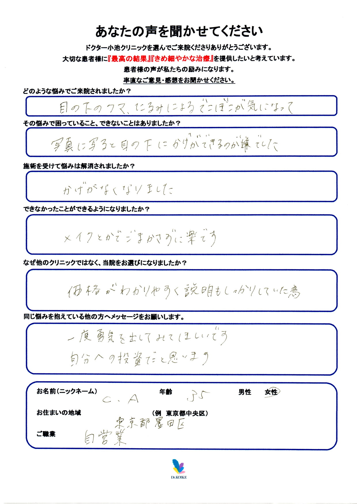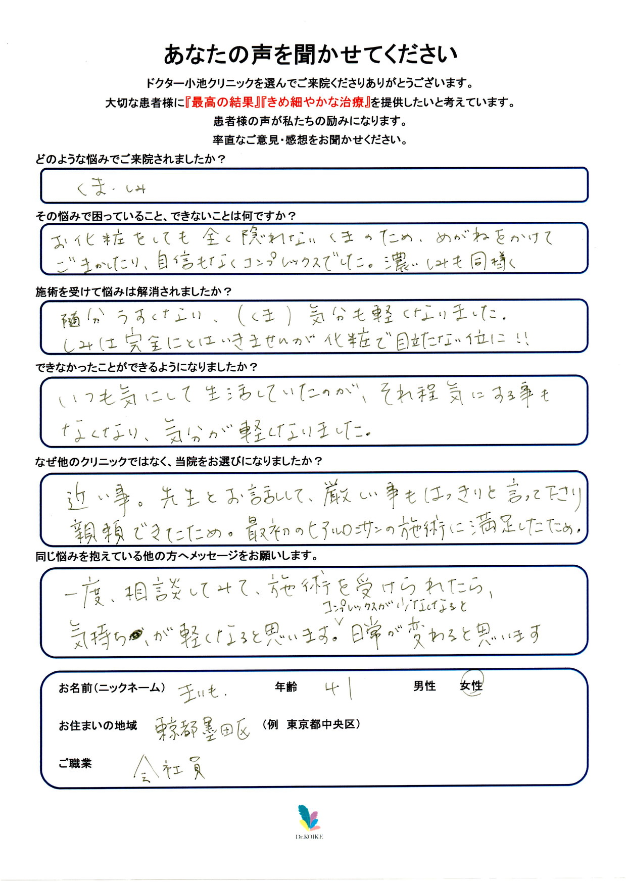 お化粧をしても全く隠れないくまのため、眼鏡をかけて誤魔化したり自信もなくコンプレックスでした。