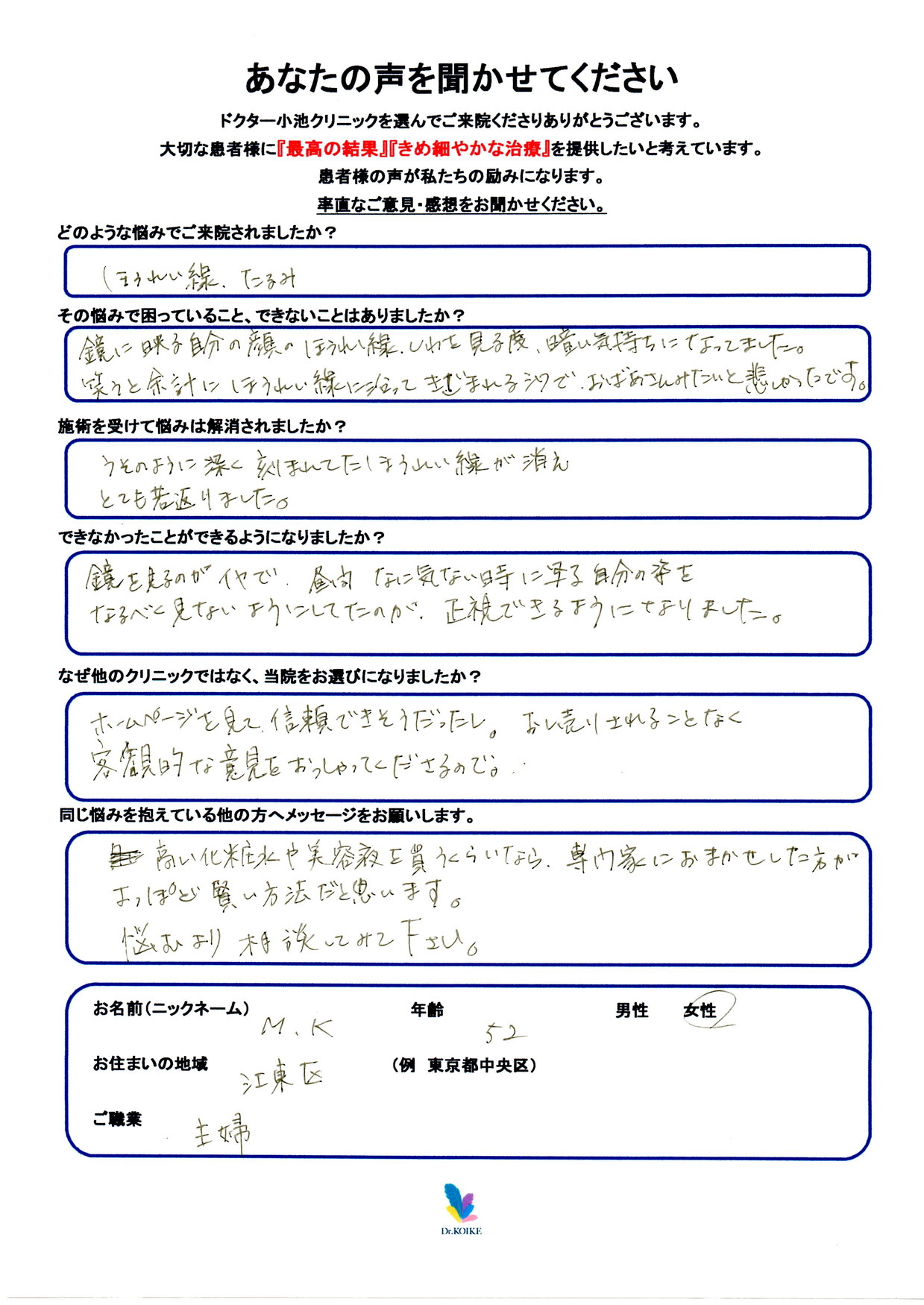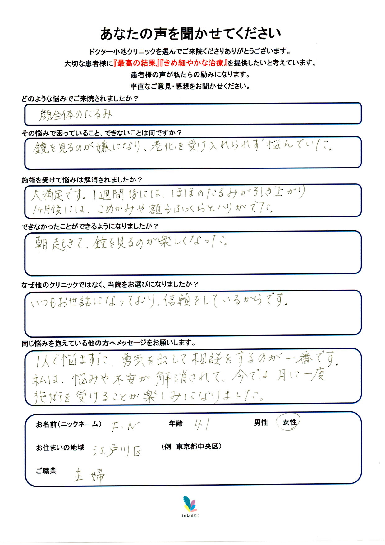 大満足です。一週間後にはほほのたるみが引き上がり、一ヶ月後にはこめかみや額もふっくらとハリがでた。