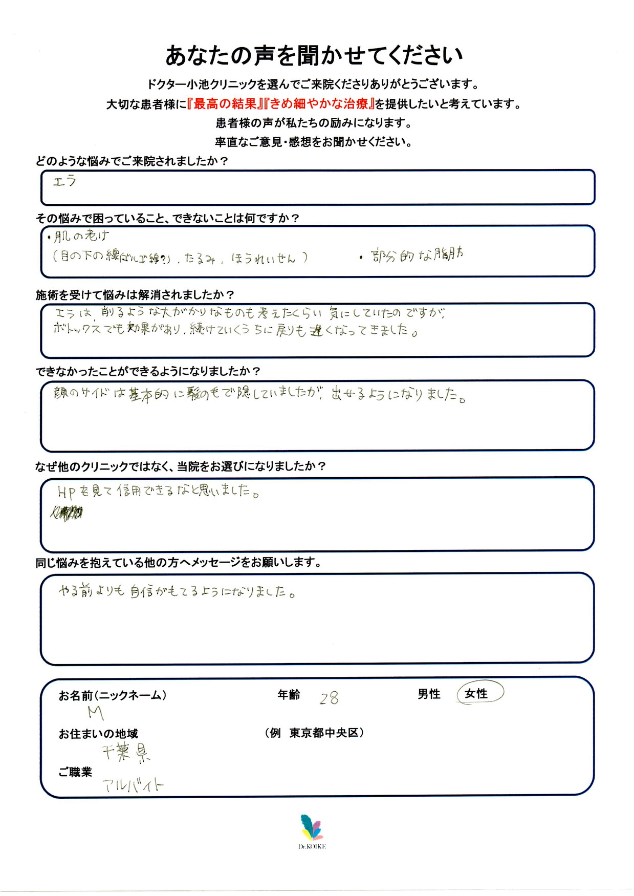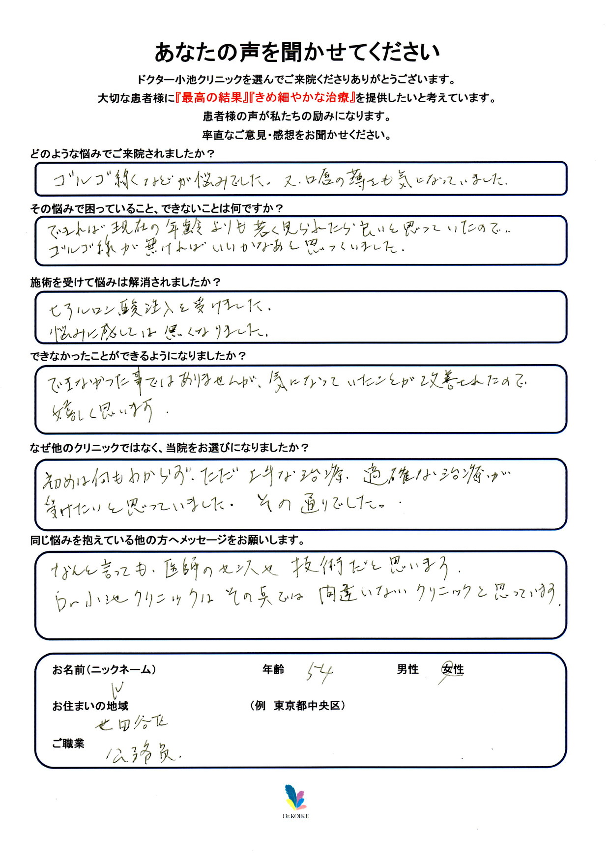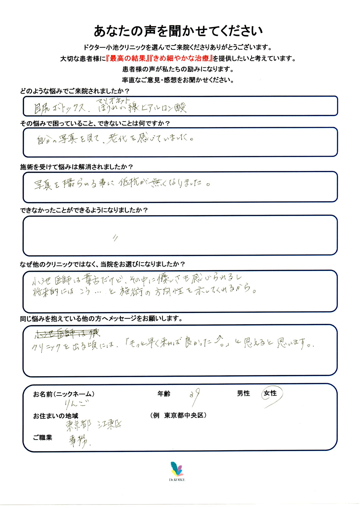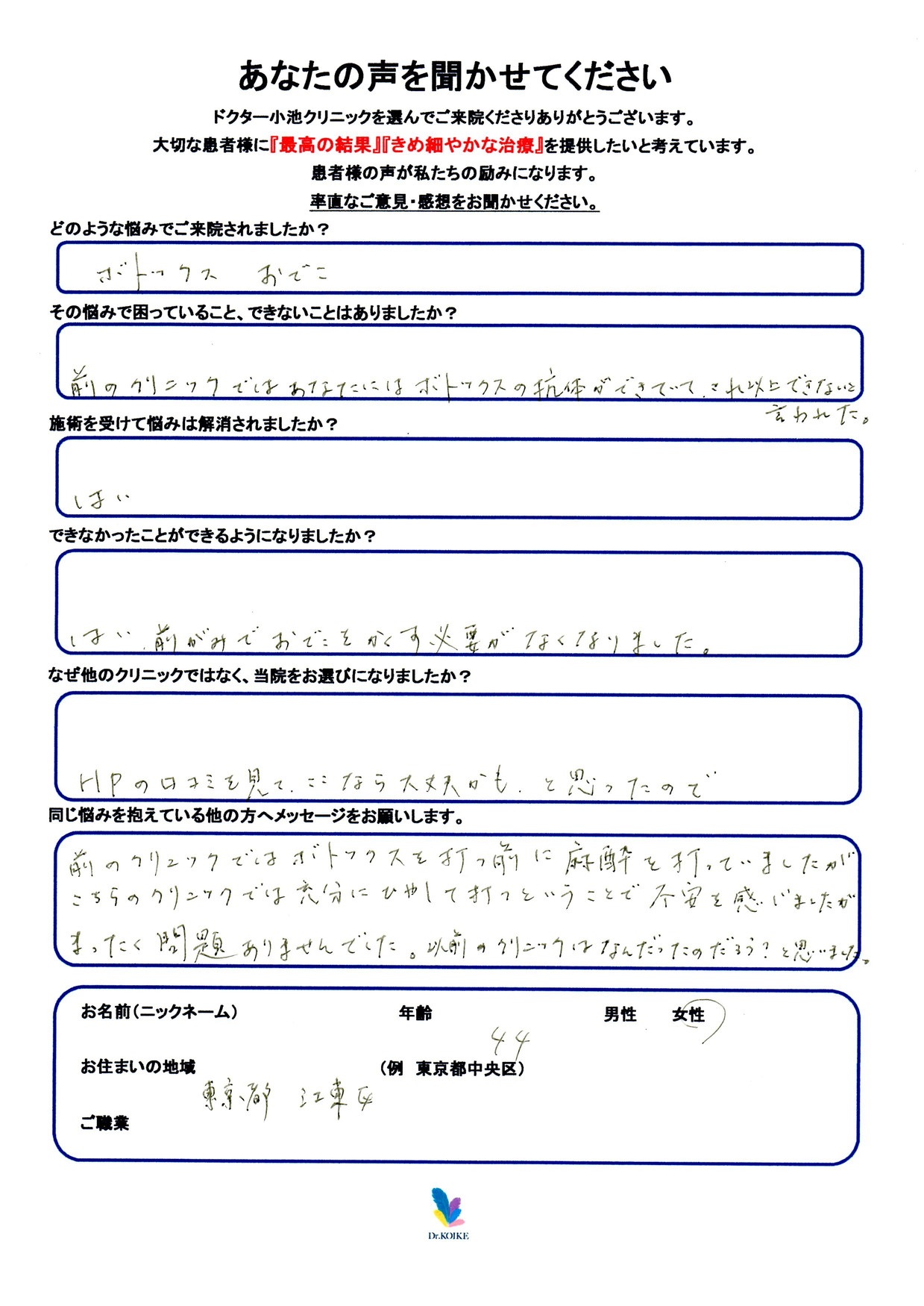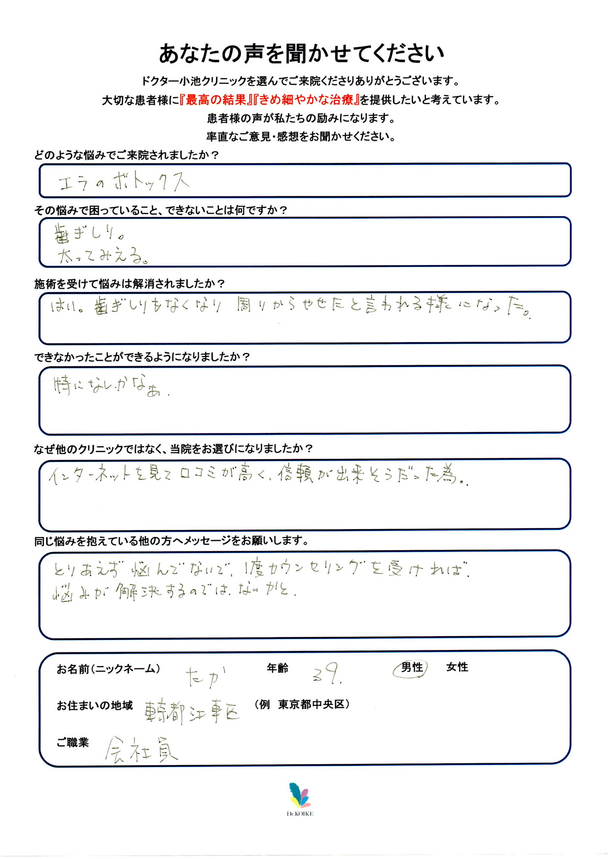 マンションのポストに入っていたチラシを見て来店しましたが院長先生、看護婦さんが親切で、来て良かったと思いました。ボトックスをどこで施術しようか悩んでいた時だったので、来て良かった
