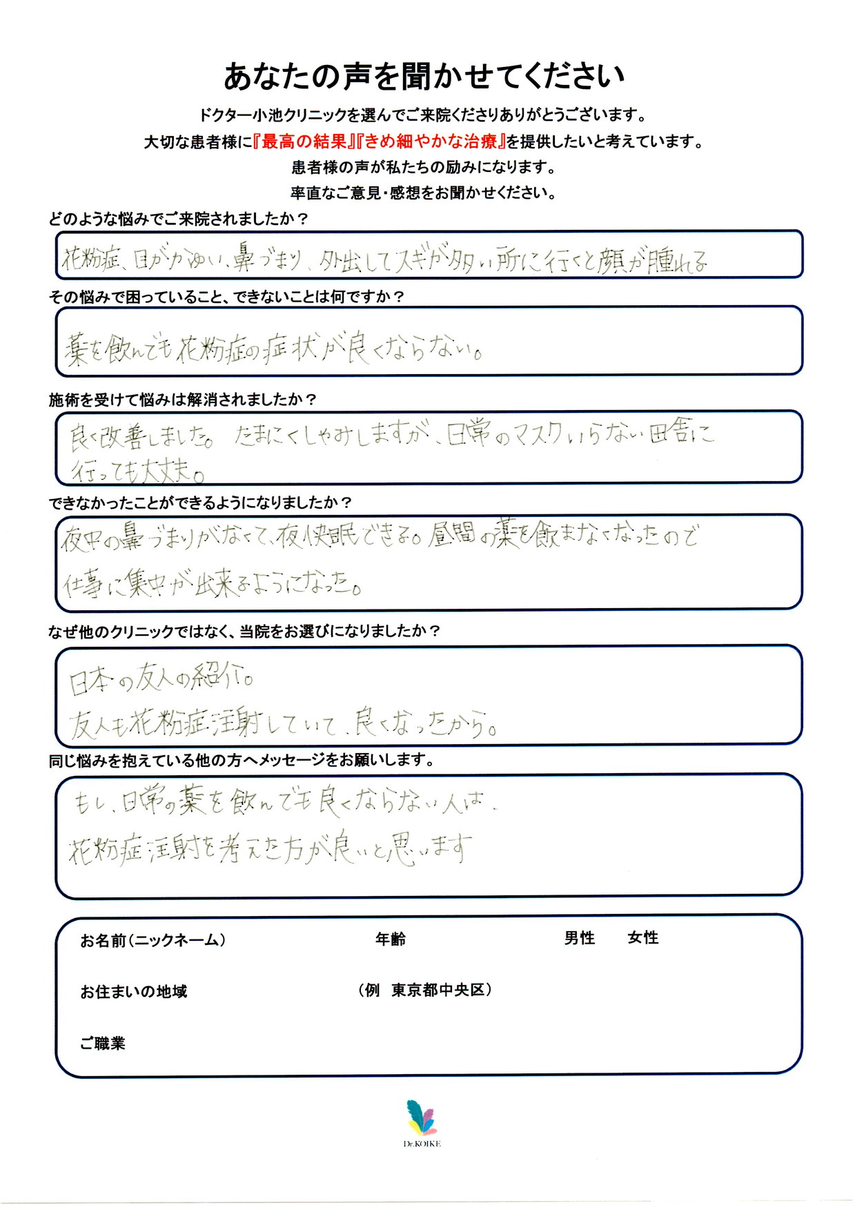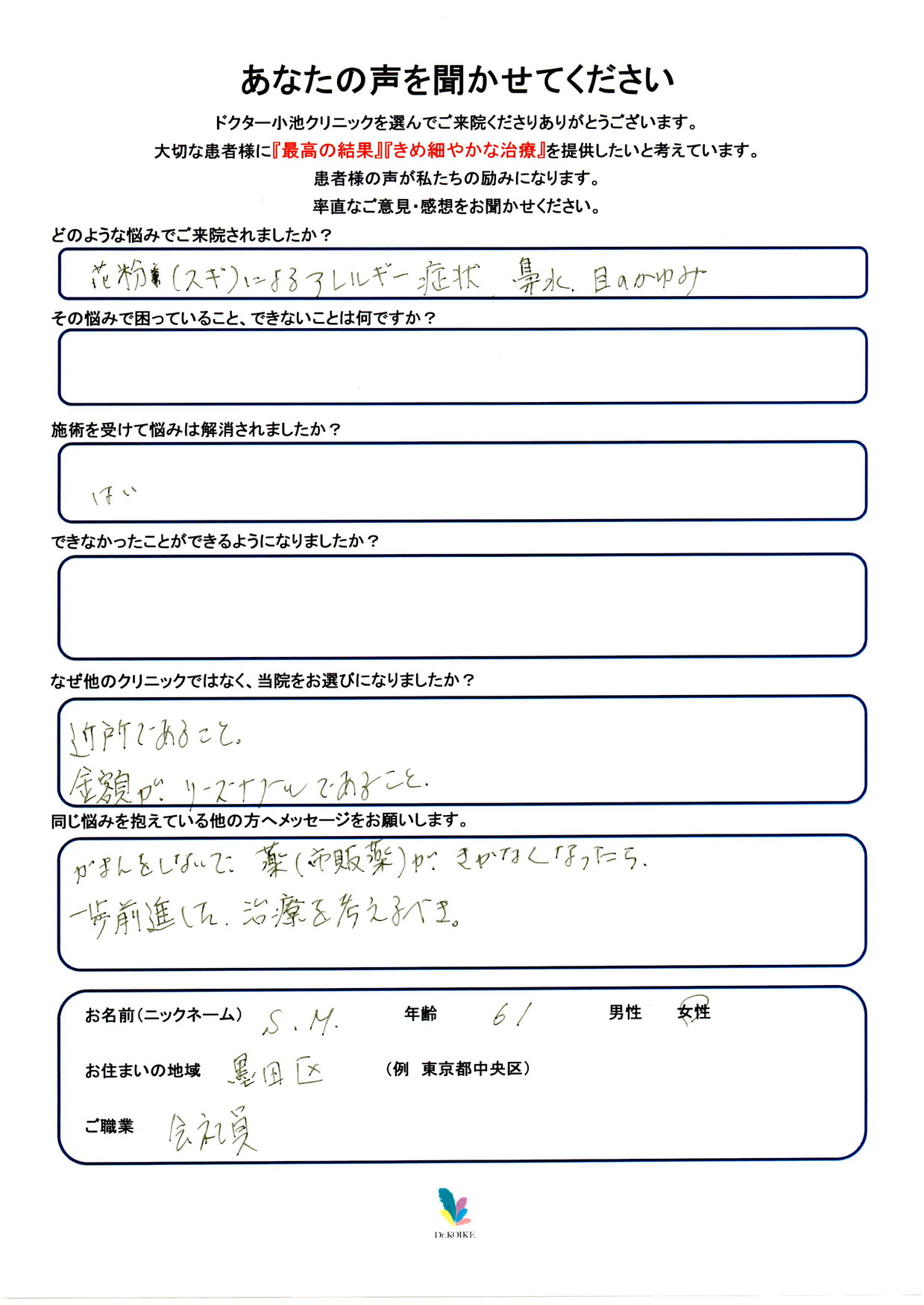 先生やナースのみなさんが優しくて親身なところと、効果があるという実体験でずっとこちらのクリニックでお世話になっています。