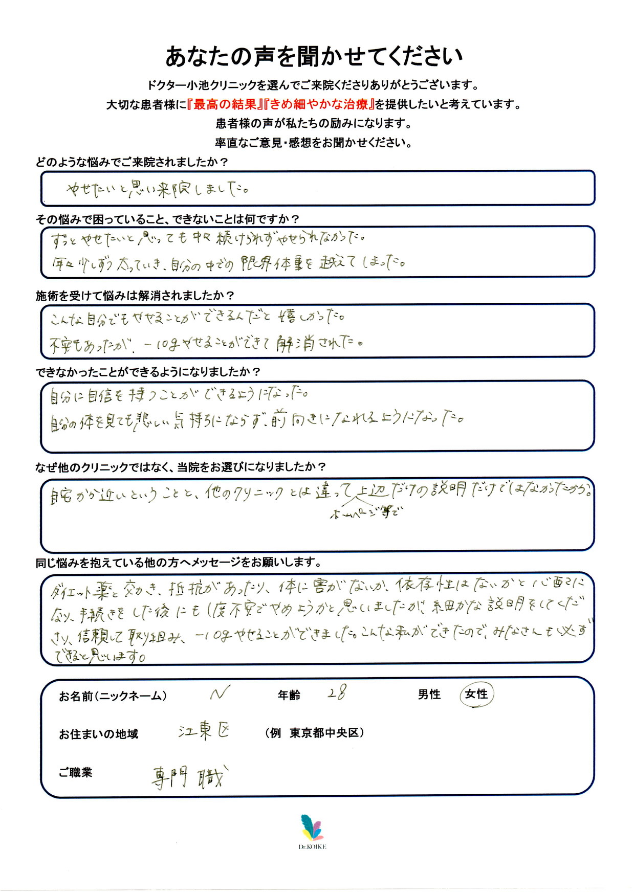 最初は半信半疑でしたが、実施してすぐに効果が出てきたので体重計に乗るのが毎日楽しみになりました。即効性を求める人にはとても良いと思います。安心して相談してみて下さい。