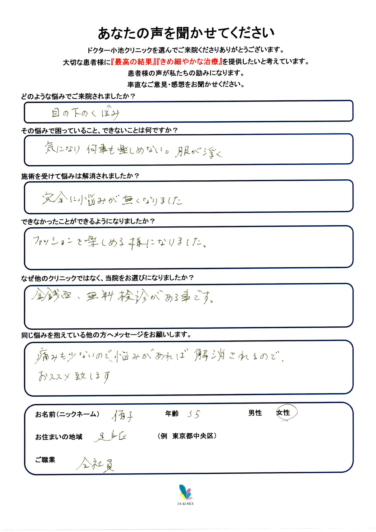 目の下のたるみは、顔の印象をとても左右するので、気にされているなら、先生に相談されるといいと思います。私も失敗したらどうしようと悩みましたが、現在は満足しています。