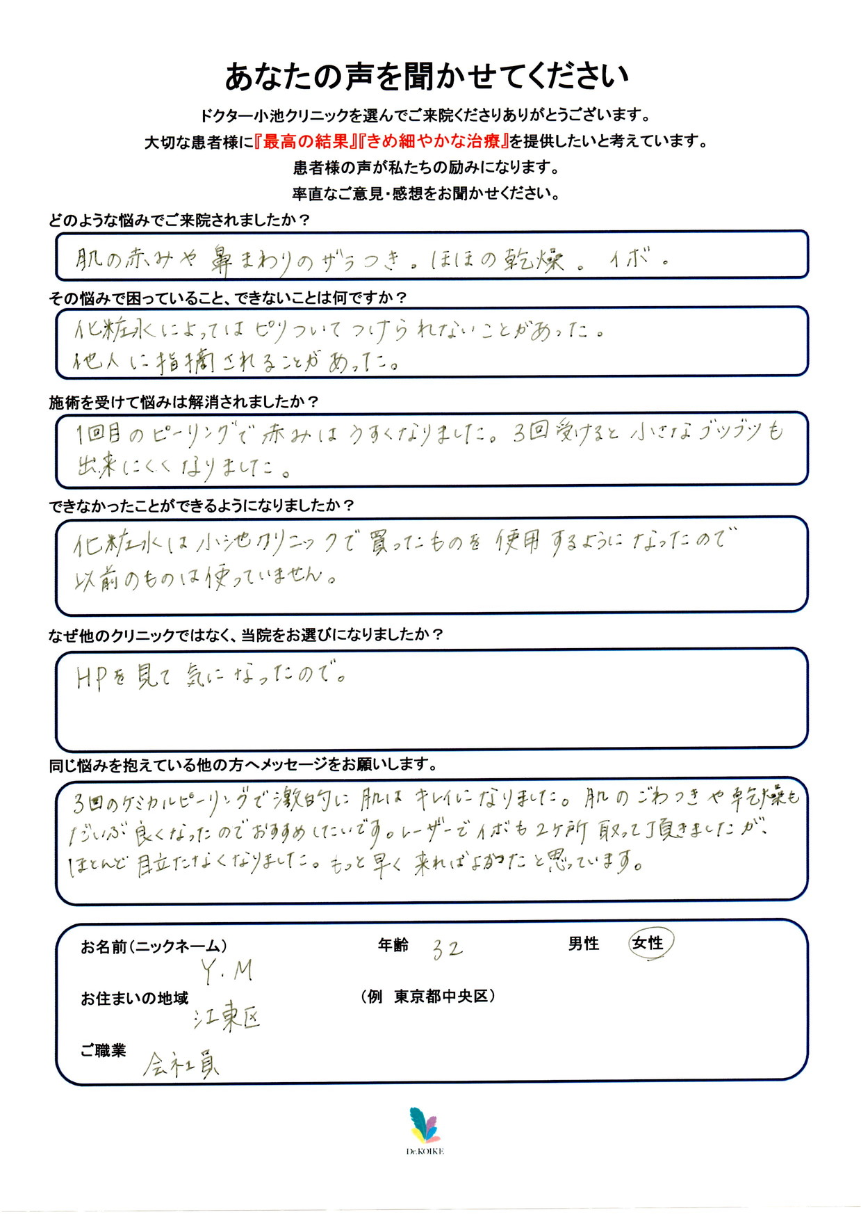 3回のケミカルピーリングで劇的に肌は綺麗になりました。肌のごわつきや乾燥もだいぶ良くなったので、おすすめしたいです。