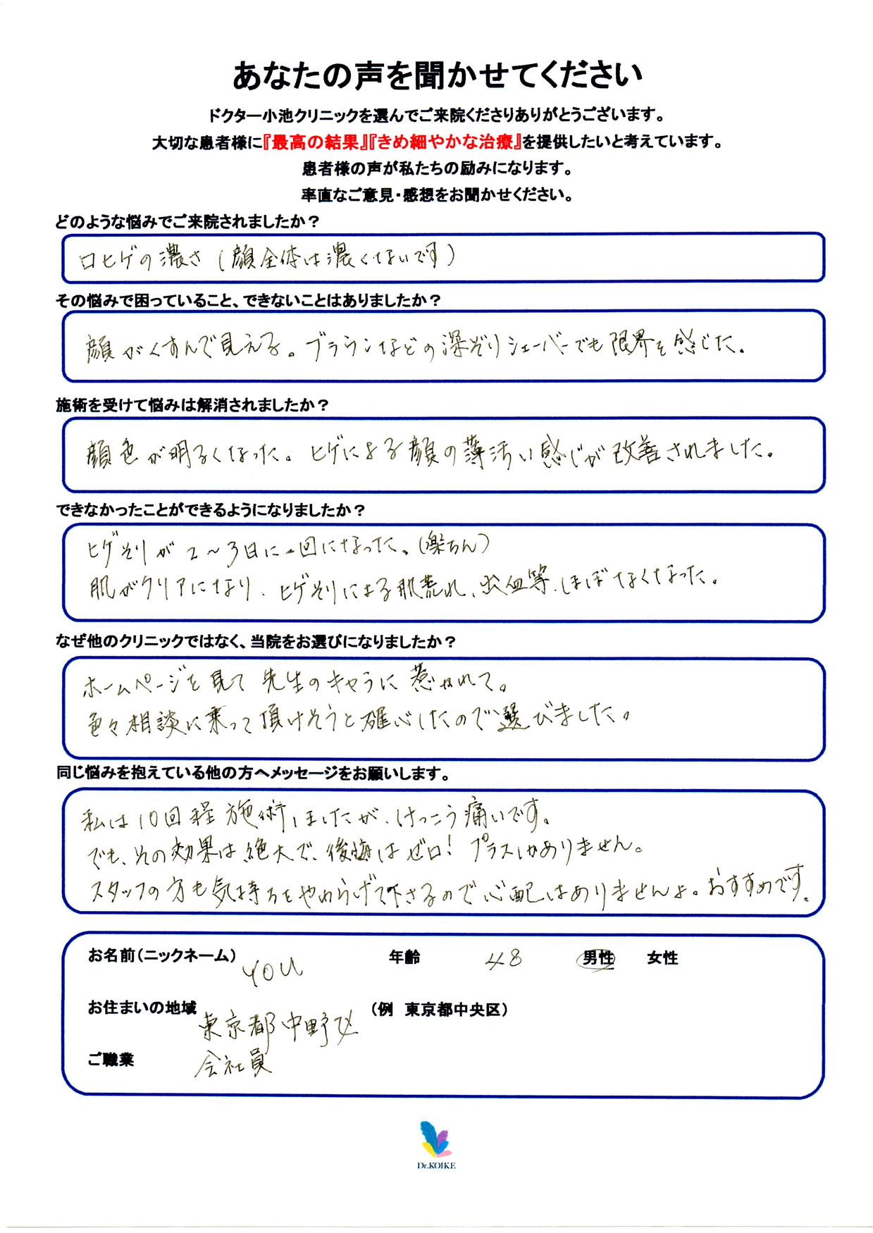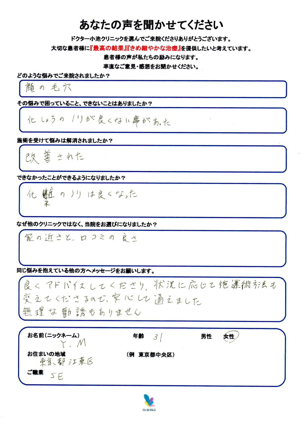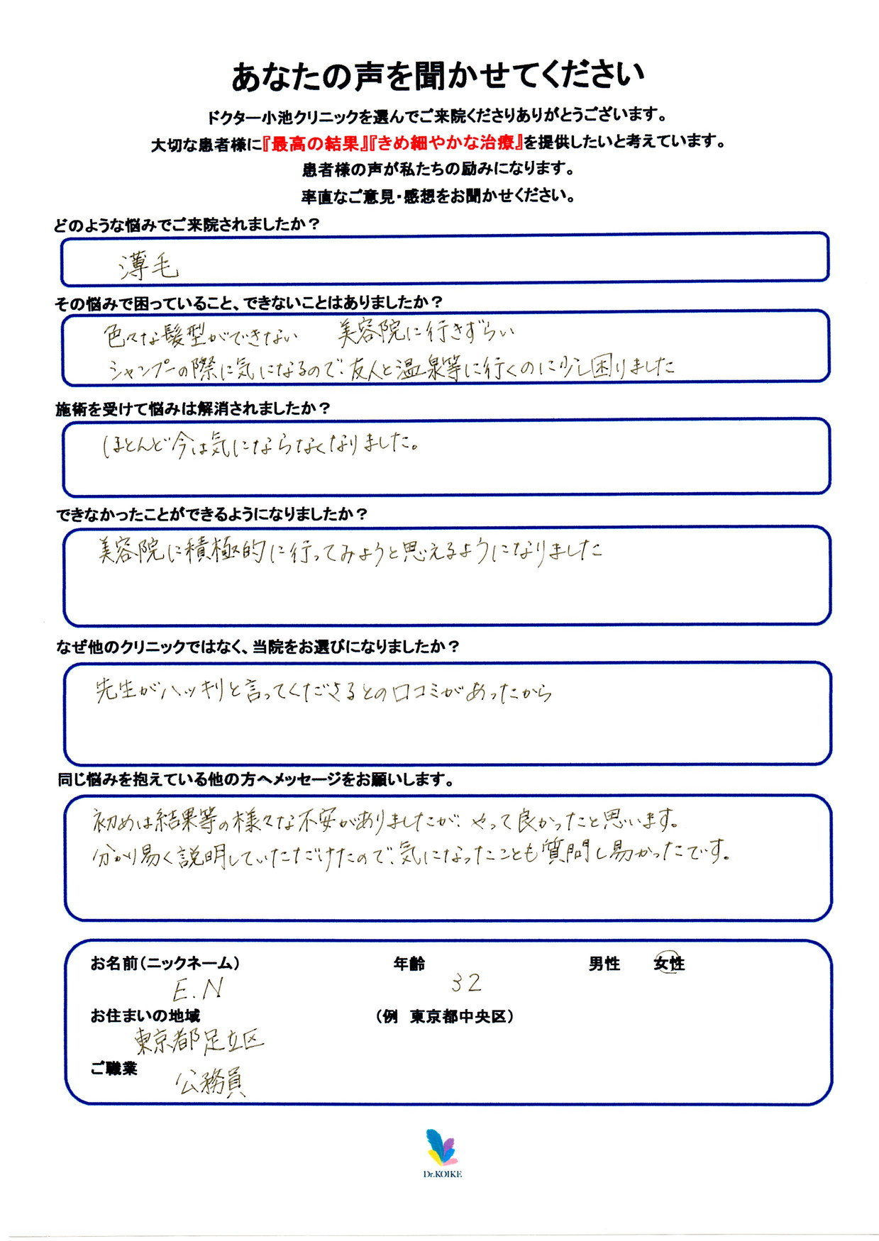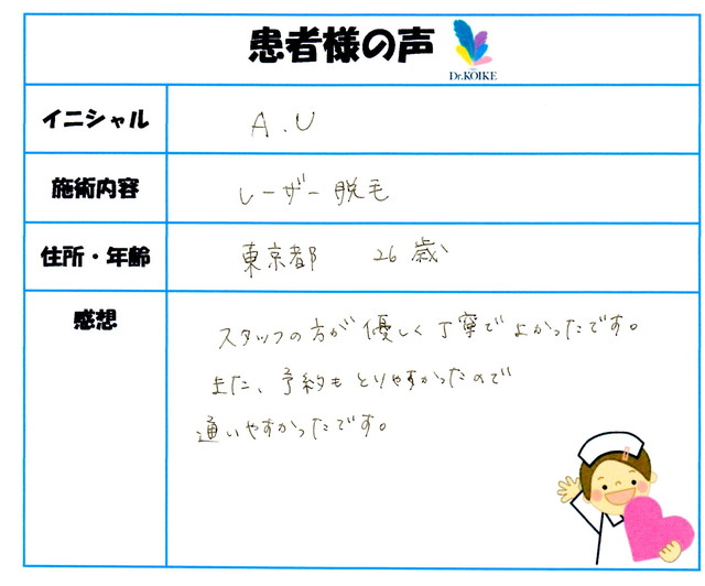 どこのクリニックに行ったらよいかわからず、ネットなどであちこち調べました。ホームページを見て、小池先生の話を読んで、信頼出来そう!!という気持ちで来ました。選んで良かったと思っています!
