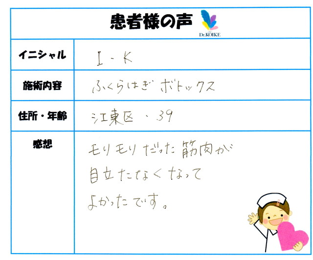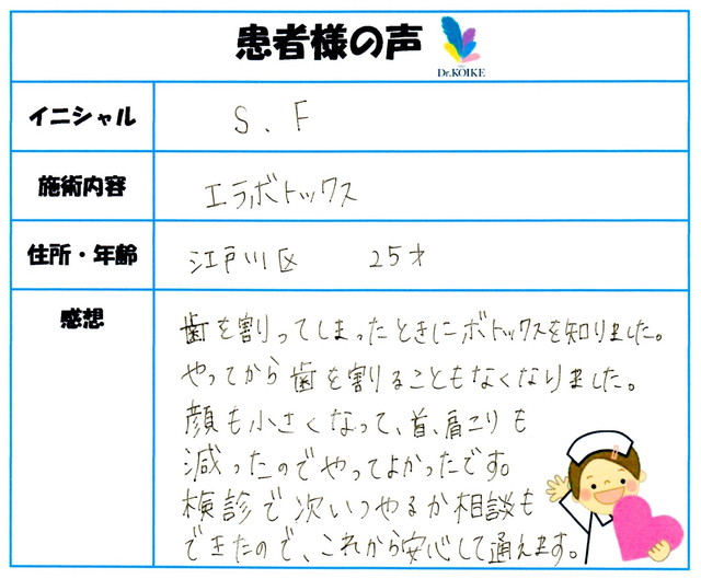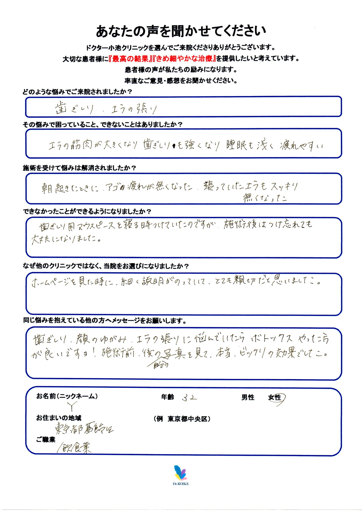 旅行も相手を起こさないか心配でした。ボトックス注射だけで改善したので楽です。量も小池先生と相談できるので安心です。整骨院に行く回数も減り、ボトックスだけでこんなに良いことばかりならもっと早くやればよかったと思っています。小顔にもなるし、凝りも改善します。