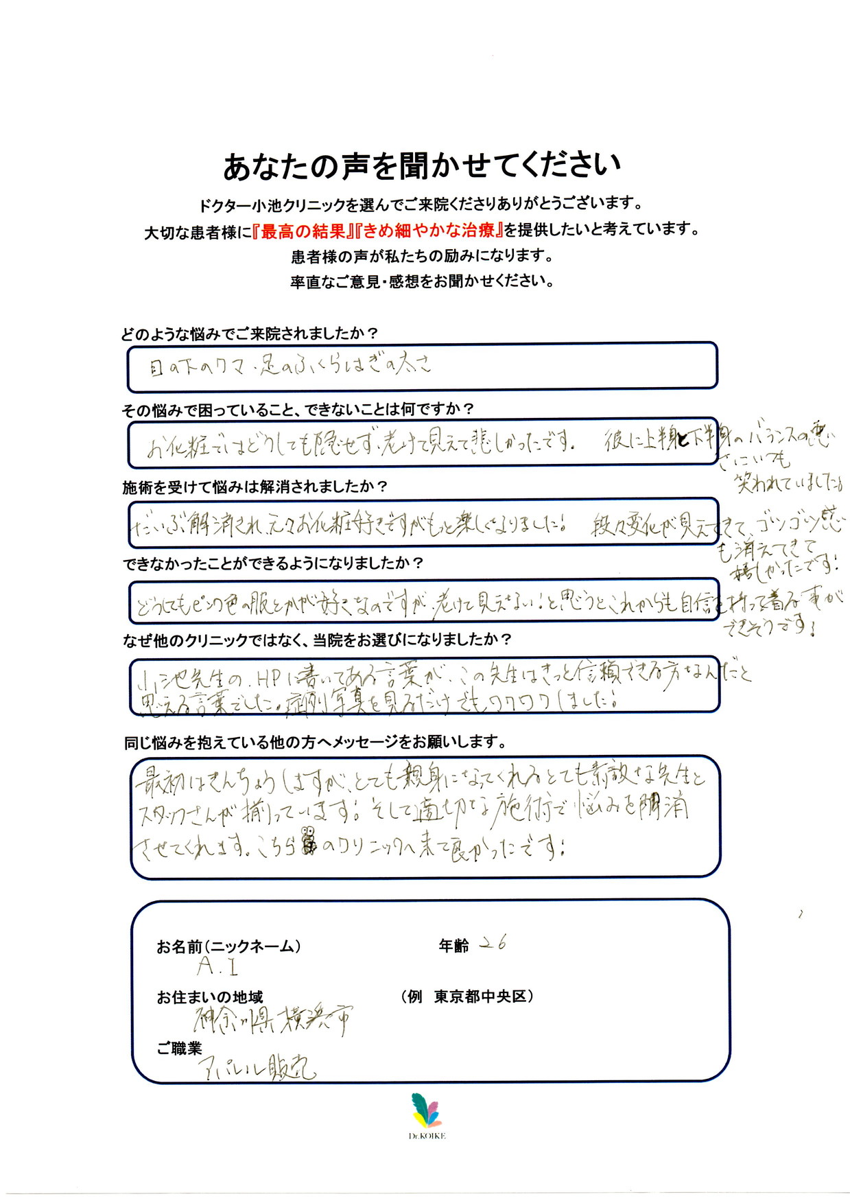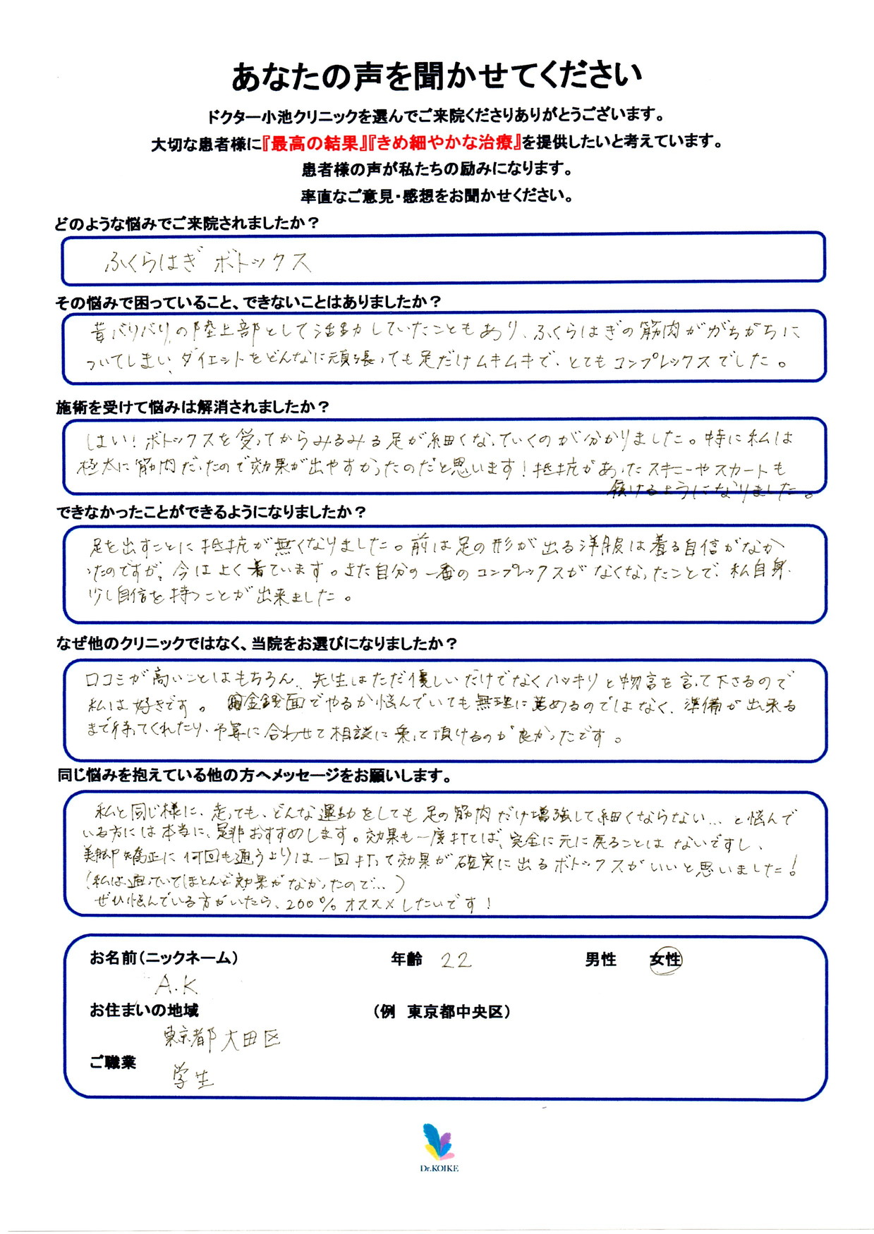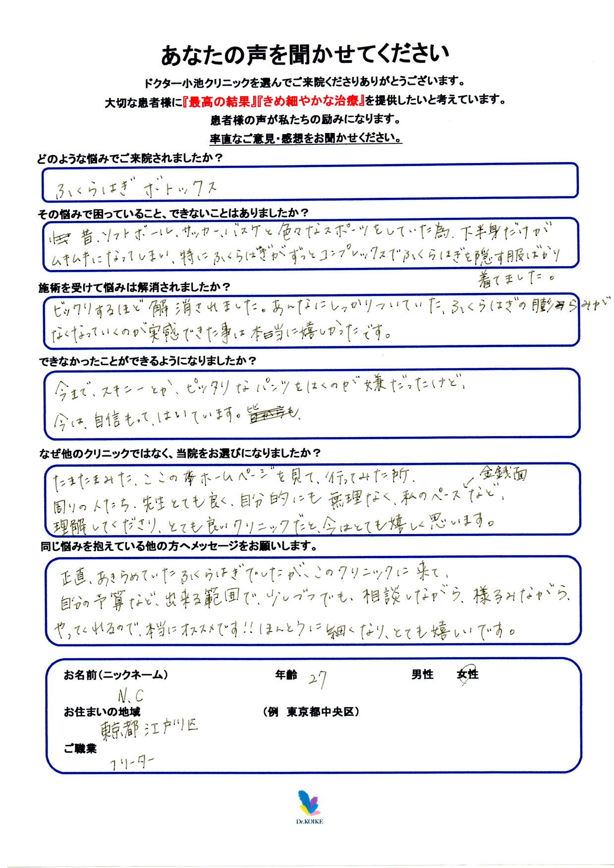正直、あきらめていたふくらはぎでしたが、このクリニックに来て、自分の予算など、出来る範囲で、少しずつでも、相談しながら、様子みながら、やってくれるので、本当にオススメです!!ほんとうに細くなり、とても嬉しいです。