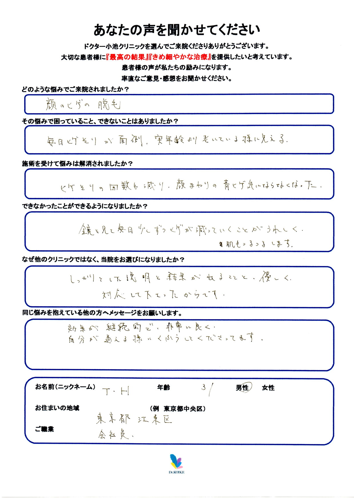 顔色が明るくなった。ヒゲによる顔の薄汚い感じが改善されました。