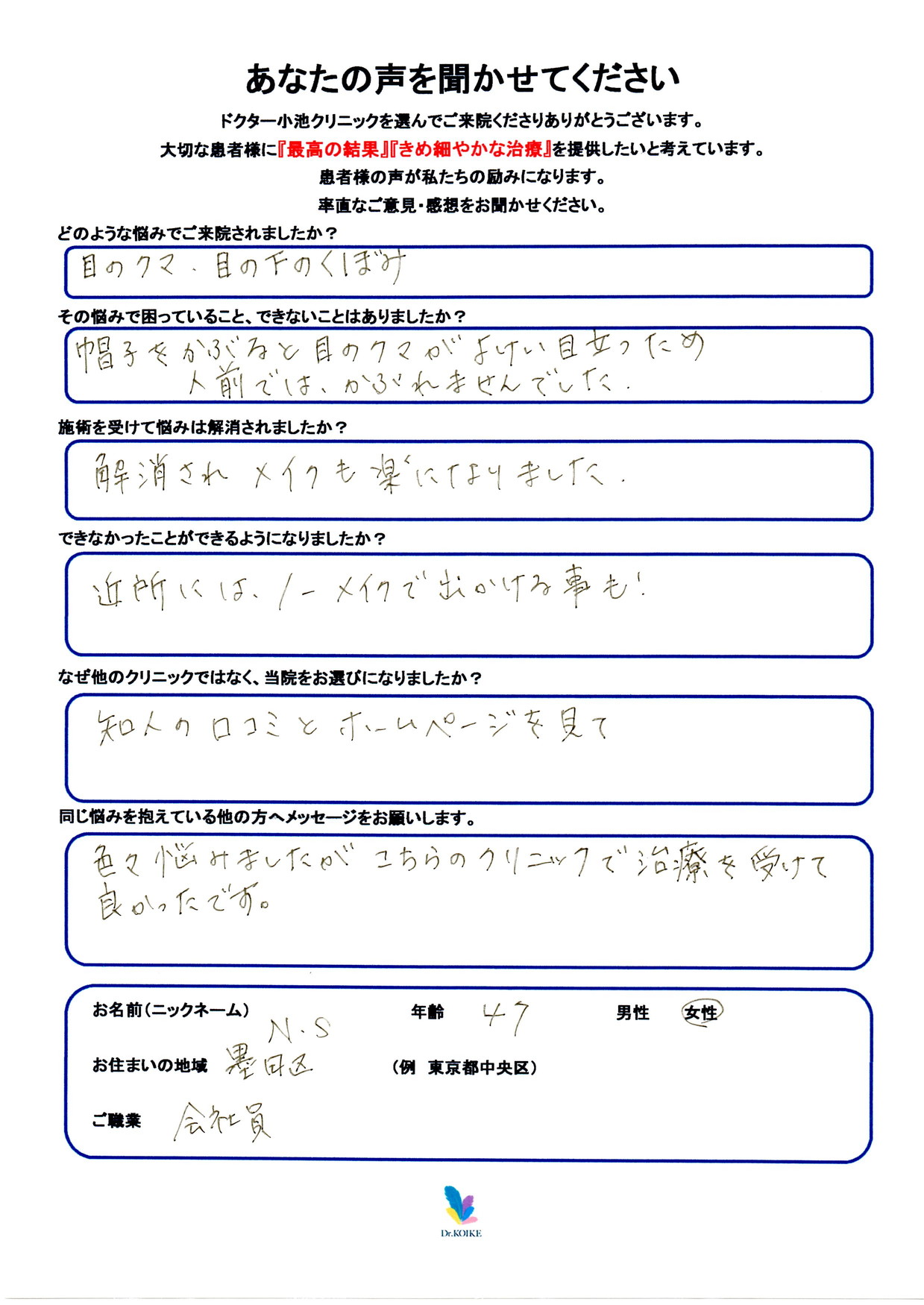 通勤時、職場の入り口に写る自分の目の下のたるみを毎日見るのが本当に悲しくて、朝から気持ちがブルーでしたが、今は毎日見ても「消えてる!!気にならない」です。