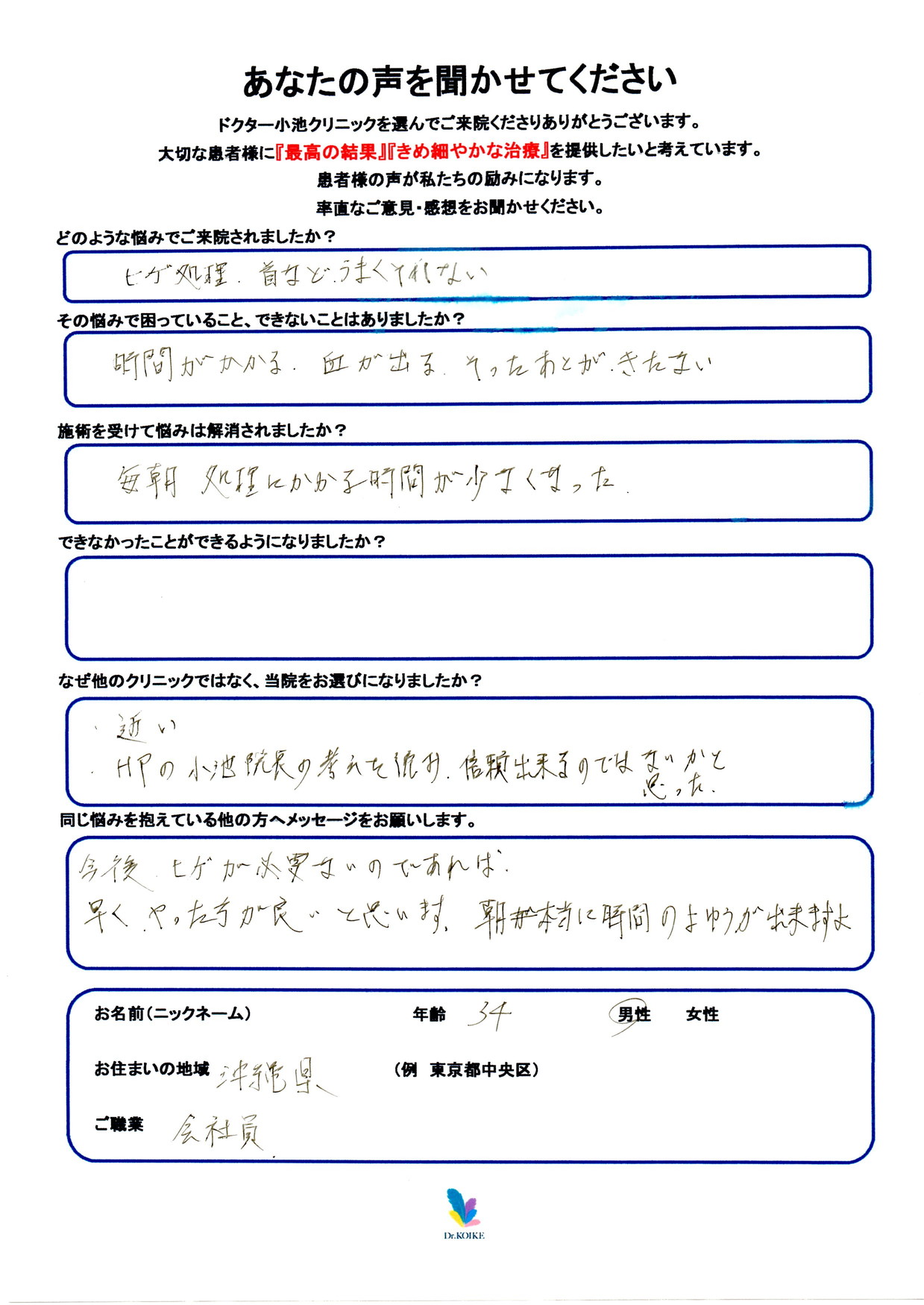 ヒゲそりが2~3日に一回なった。(楽ちん)肌がクリアになり、ヒゲそりによる肌荒れ、出血等、ほぼなくなった。
