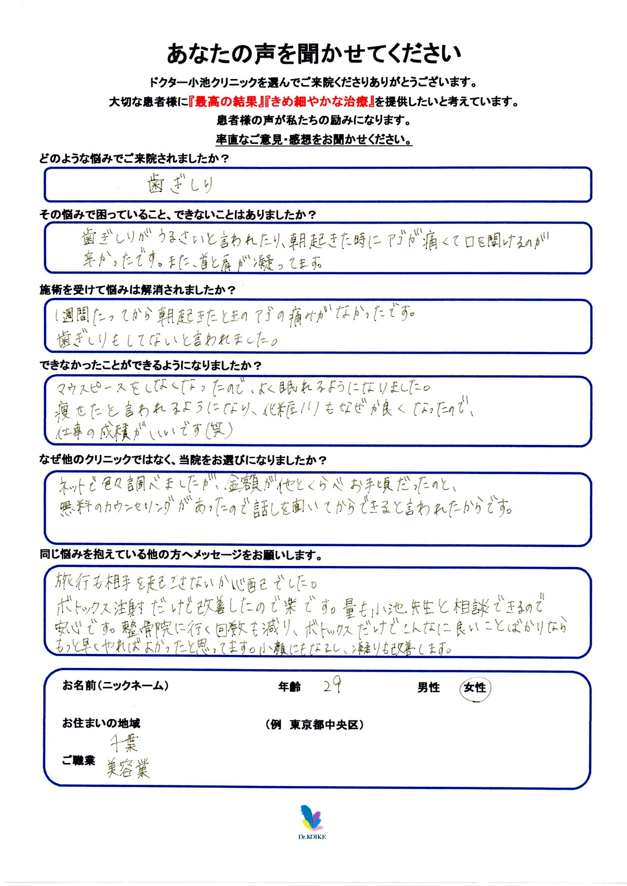 歯ぎしり用マウスピースを寝る時につけていたのですが、施術後はつけ忘れても大丈夫になりました。