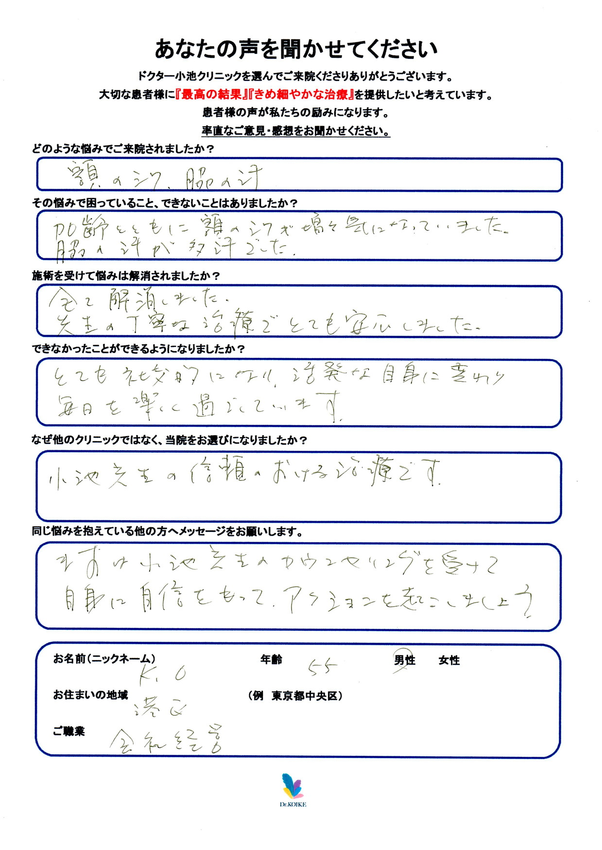 加齢とともに額のシワが増々気になっていました。脇の汗が多汗でした。