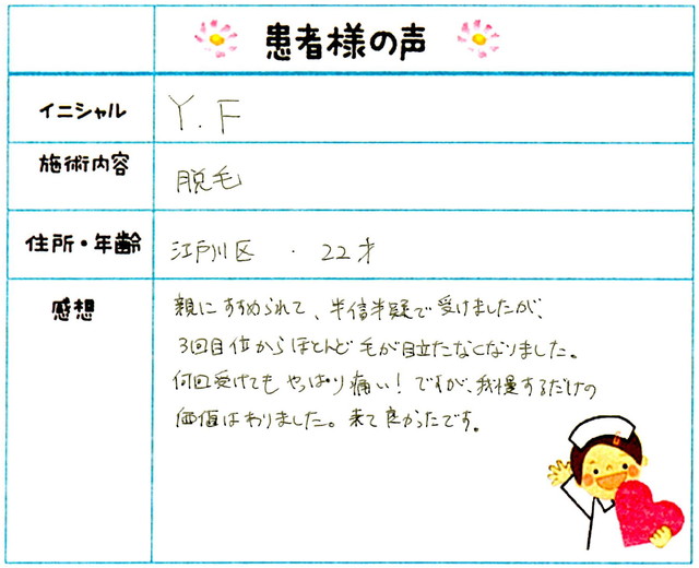 230. 脱毛(ボディ) 東京都 江戸川区 23才女性 A.F様