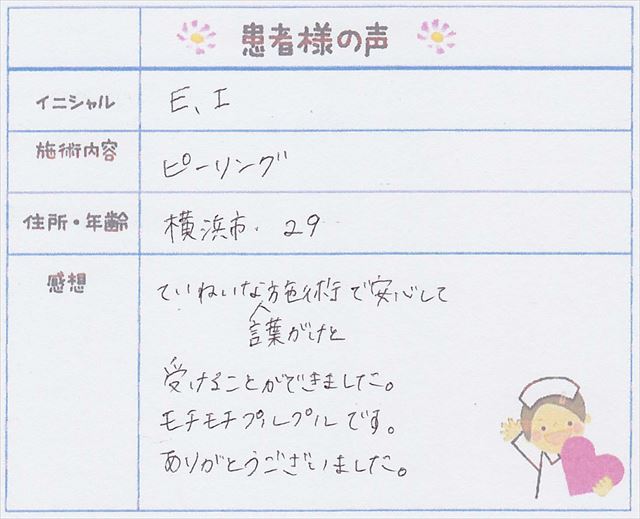 ピーリングや脱毛も、いつも丁寧にして頂いて、ありがとうざいます。