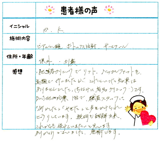 133. シワ・たるみ・肌質改善 詳細地なし 51才女性 S.K様