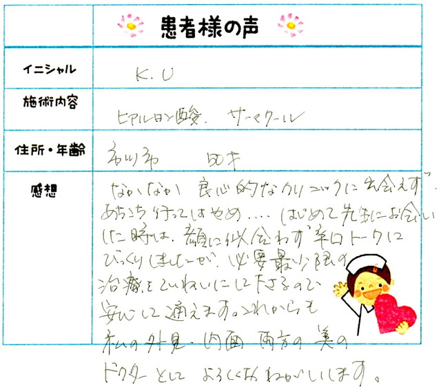 その人の悩みに応じて、また予算に応じて親切に解答下さりとても信頼できるクリニックです!先生をはじめ、スタッフの方もやさしくとても親切でいらっしゃいます。安心してお任せでき、効果も実感できますので、悩みがある方は是非一度足を運ばれることをおススメします!