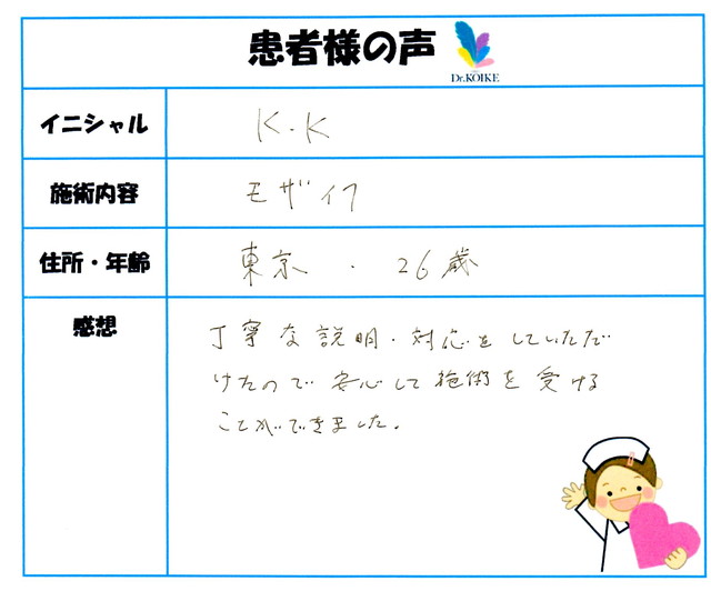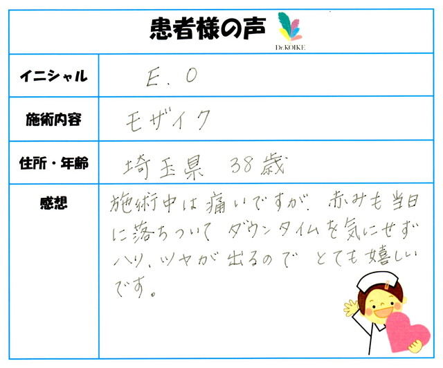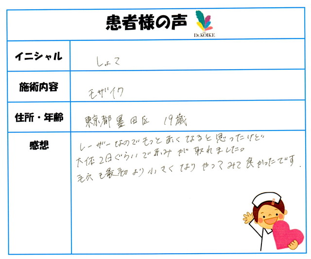 レーザーでイボも二カ所取って頂きましたが、ほとんど目立たなくなりました。もっと早く来れば良かったと思っています。