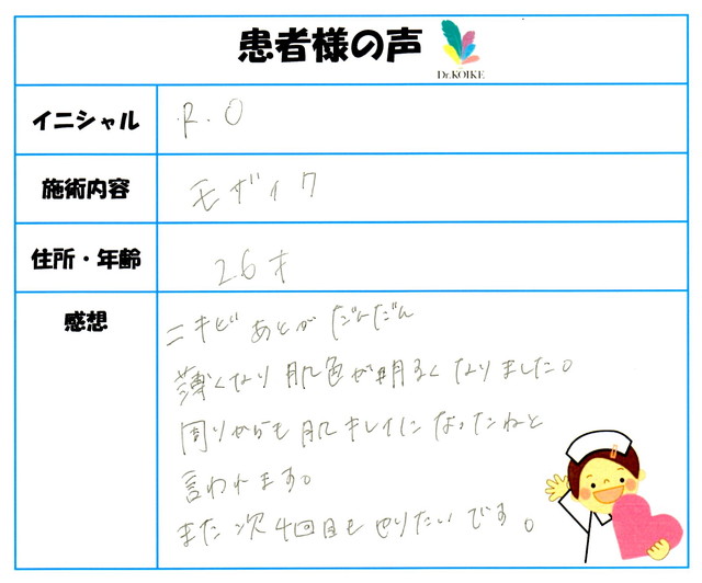 ニキビあとがだんだん薄くなり肌色が明るくなりました。周りからも肌キレイになったねと言われます。また次4回目もやりたいです。