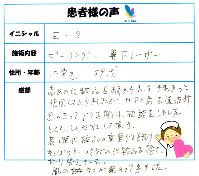 高めの化粧品をすすめられるまま、ずっと使用しておりましたが、H・Pの前を通った所、思いきってドアを開け、相談しました。とても、しんせつにして頂き、基礎化粧品の重要性を知りきっぱりと、いままでの化粧品を捨て、切り替えました。肌のキメが整って来ました。