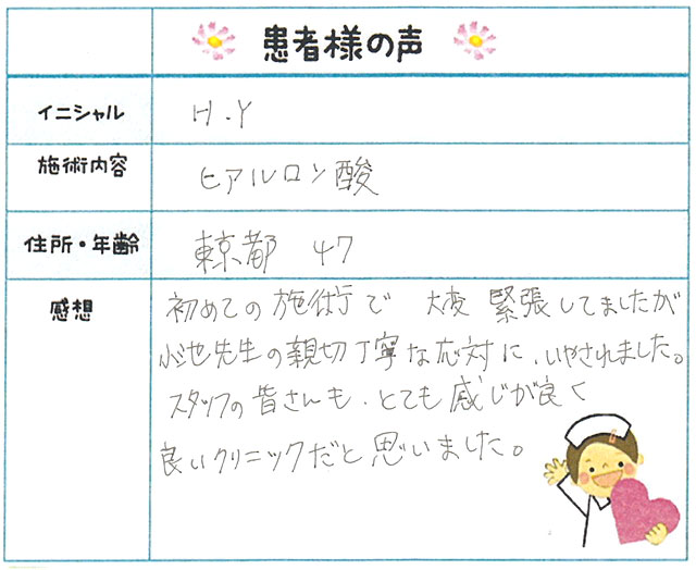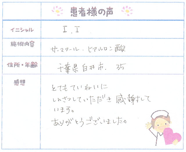 お友だちが他のクリニックで治療をうけて、紹介されましたね。 そちらが今ひとつな気がしたということで、 当院を選んでいただき、ありがとうございます。 希望どおりで何よりです。